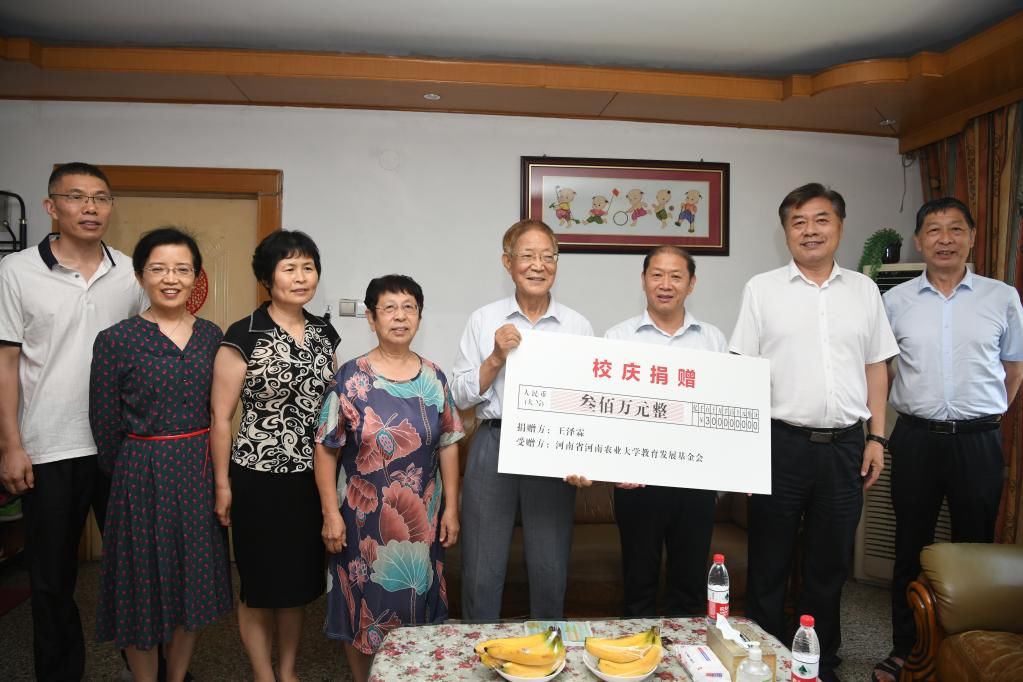 王泽霖(右四)向学校捐赠300万元。(河南农业大学供图)